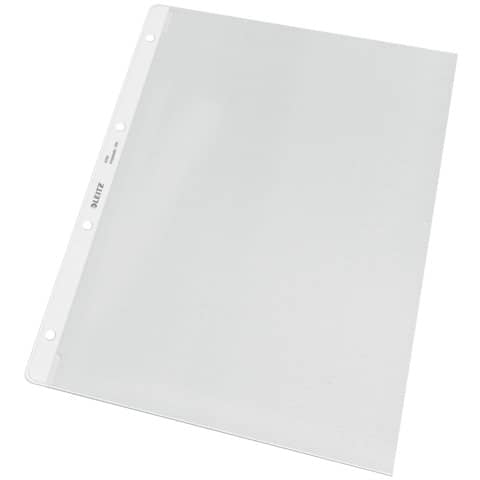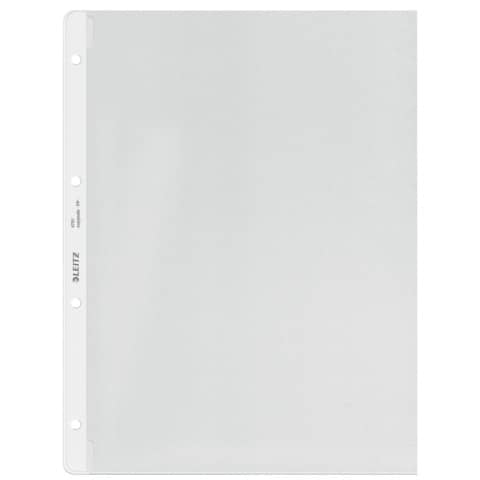 Prospekthülle, Lochseite offen, mit Papiereinlage, stabil und reissfest, mit Greifausschnitt links oben, mit Einreißschutz an der linken unteren Ecke, dokumentenecht, genarbt, mit 4-fach Lochung. Material: Polypropylen (PP), 0,13 mm. Format: für A4. Farbe: farblos.