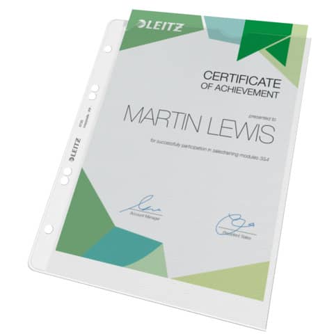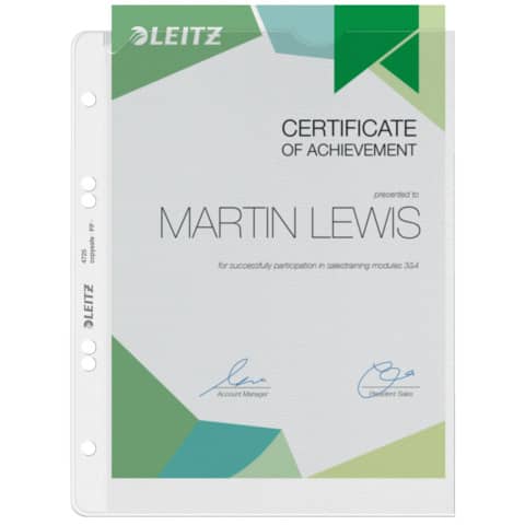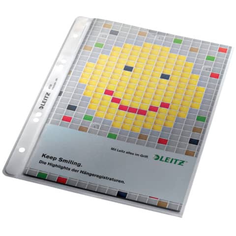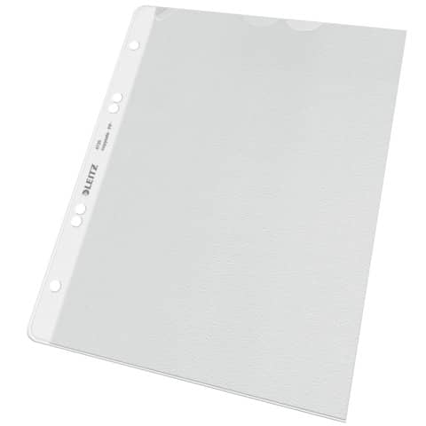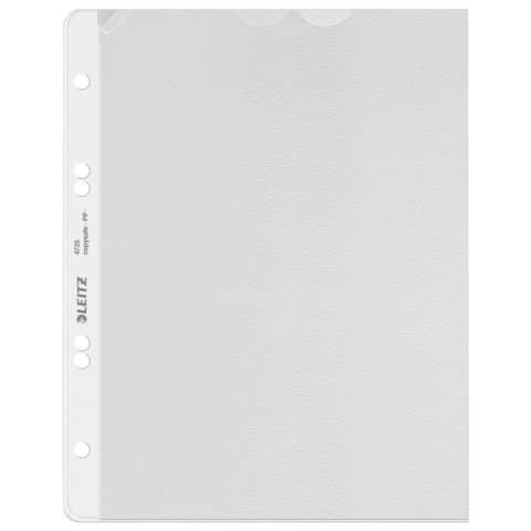Leitz Prospekthülle Extrastark, oben offen, mit Papiereinlage, Einreißschutz und Daumenausschnitt, stabil und reissfest, dokumentenecht, genarbt, mit 4-fach Lochung. Material: recycelbares Polypropylen (PP), 0,13 mm. Format: für A5. Farbe: farblos.