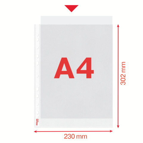 Prospekthülle Standard, oben offen, mit verstärktem Lochrand, dokumentenecht, genarbt, mit Universallochung. Material: Polypropylen (PP), 0,07 mm. Format: für A4. Inhalt: 100 Stück. Farbe: farblos.