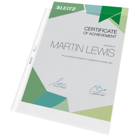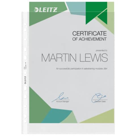 Prospekthülle Standard, oben offen, dokumentenecht, genarbt, mit Multilochung. Material: Polypropylen (PP), 0,10 mm. Format: für A4. Farbe: farblos.