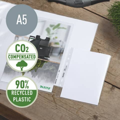 Leitz Prospekthülle Recycle. Hergestellt aus 90% recyceltem und säurefreiem Material und zu 100% recycelbar (extern geprüft und von UL zertifiziert). Langlebig und wiederverwendbar. Säurefreies Material verhindert, dass das Papier mit der Zeit gelblich wird. Oben offen. Mit 6-fach Lochung. Mit Verstärkungsstreifen aus klarer, recycelter Folie. Dokumentenecht. Genarbt. Verpackung aus recyceltem Kunststoff und 100% Recyclingpapiereinlage. Material: 90% recyceltes Polypropylen (PP), 0,10 mm. Format: für DIN A5, 171 x 216 mm. Inhalt: 25 Stück. Farbe: farblos.