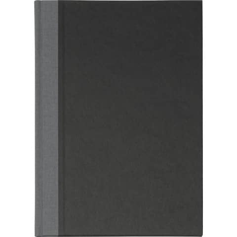 Holzfreies, weißes Papier, 90 g/qm, fadengeheftet. Mit grauer Speziallineatur mit Raster und Seitenzahlen, 2 Lesebänder (grau und schwarz) und Deckelschild lose eingelegt. Einband aus schwarzer, kratz- und scheuerfester Elefantenhaut und gerundetem grauen Geweberücken. Größe: A4.