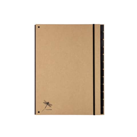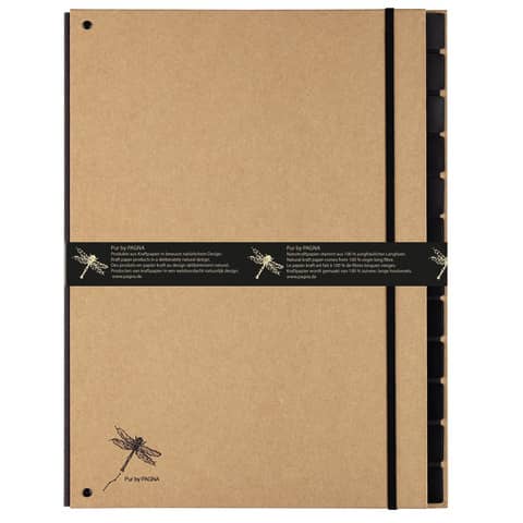 Pultordner Pur, für Dokumente im Format A4, 12 Fächer, natur, Einband aus stabilem Graukarton (RC) mit Kraftpapier überzogen, mit dehnbarem Rücken, 3 Schaulöchern im Buchblock, reißfesten Seiten aus schwarzem Karton (RC), schwarzen neutralen Taben aus langlebigem PP, zusätzlicher Verschluss mit Gummizug, mit hochwertiger schwarzer Prägung einer Libelle.