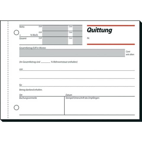 Quittungs-Formular, Format A6 quer, mit MwSt.-Nachweis. Fälschungssicherer Dokumentendruck. Besonders anwenderfreundlich: Jedes Blatt mit Abheftlochung und ultra-feiner Microperforation für leichtes und sauberes Abtrennen. Formularbuch mit besonders haltbarer Spezial-Rückenleimung.