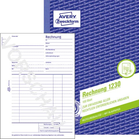 Die Rechnungen von Avery Zweckform enthalten alle wichtigen Angaben wie Steuernummer, Umsatzsteuer Identifikationsnummer, Bankverbindung sowie Angaben zu Artikeln und Preisen. Damit stellen Sie die steuerliche Anerkennung sicher. Mit Mikroperforation und 1 Blaupapier, wahlweise mit/ohne Durchschlag einsetzbar. Mit dem Blauen Engel zertifiziert und aus 100% Altpapier hergestellt.