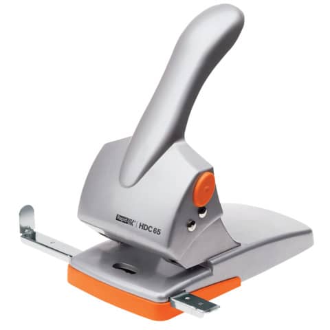 Registraturlocher HDC65, mit Anschlagschiene aus Metall, mit arretierbarem Oberteil zum platzsparendem Verstauen und großem Auffangbehälter. Stanzleistung/Blatt: 6,5mm/65. Material: Gussmetall. Farbe: silber/orange.