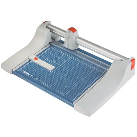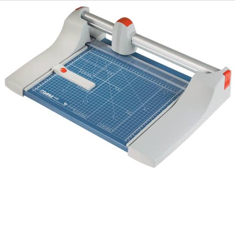 Roll- & Schnitt-Schneidemaschine Dahle 440. Auswechselbarer Messerkopf vorhanden. Art der Betätigung der Pressung: automatische Pressung. Max. Papierformat: DIN A4 = 21,0 cm x 29,7 cm. Raster mit Formatgrößen vorhanden. Aufhängemöglichkeit zur Wandmontage. Masse (Gewicht): 3,9 kg. Farbe: Blau. Material des Tisches: Metall. Tischgröße (B x T): 384 x 560 mm. Länge des Schnittes: 360 mm. Max. Stärke des Stapels je Schnittarbeitsgang: 3,5 mm. Max. Anzahl der Blätter (70g/qm) je Schneidearbeitsgang: 35 Blatt. Max. Anzahl der Blätter (80g/qm) je Schneidearbeitsgang: 28 Blatt.