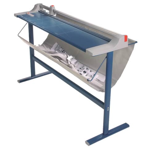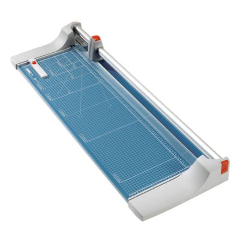 Roll- & Schnitt-Schneidemaschine Dahle 446. Auswechselbarer Messerkopf vorhanden. Art der Betätigung der Pressung: automatische Pressung. Max. Papierformat: DIN A1 = 59,4 cm x 84,1 cm. Raster mit Formatgrößen vorhanden. Geschliffenes Rundmesser im geschlossenen Kunststoffkopf, geschliffenes Untermesser. Zwei Winkelanlagen, Rückanschlag. Wandmontage möglich. Masse (Gewicht): 7,4 kg. Farbe: Blau. Material des Tisches: Metall. Tischgröße (B x T): 384 x 1120 mm. Länge des Schnittes: 920 mm. Max. Stärke des Stapels je Schnittarbeitsgang: 2,5 mm. Max. Anzahl der Blätter (70g/qm) je Schneidearbeitsgang: 25 Blatt. Max. Anzahl der Blätter (80g/qm) je Schneidearbeitsgang: 20 Blatt.