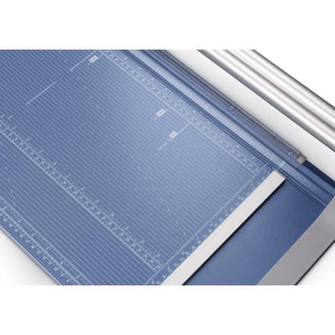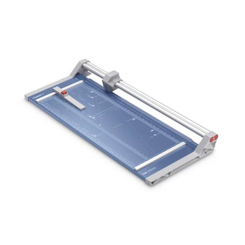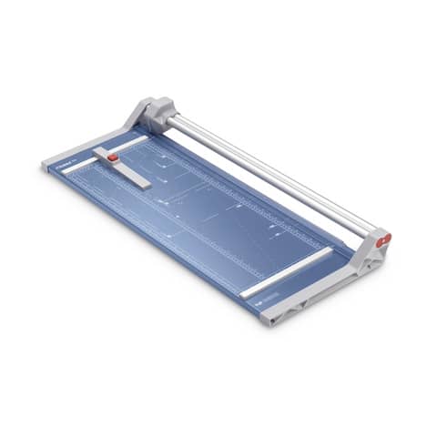 Rollenschneider Dahle 554. Stabiler Metalltisch mit rutschfesten Gummifüssen. Formatlinien mit cm/inch-Einteilung, Foto-und DIN-Formate. Beidseitige Winkelanlagen und Linealorientierung. Exakt positionierbarer Rückanschlag und doppelte Führungsstange. Rückseitige Standfüsse. Automatische Pressung. Max. Papierformat: DIN A2. Geschliffenes Rund- und Untermesser aus gehärtetem Stahl, Sicherheit durch Rundmesser im geschlossenen Kunststoffkopf, Gewicht: 5.2 kg. Farbe: blau. Tischgröße (B x T): 395 x 940 mm. Länge des Schnittes: 720 mm. Max. Stärke des Stapels je Schnittarbeitsgang: 2.0 mm. Max. Anzahl der Blätter (80g/qm) je Schneidearbeitsgang: 10 Blatt. 3. Generation mit doppelter Führungsstange.