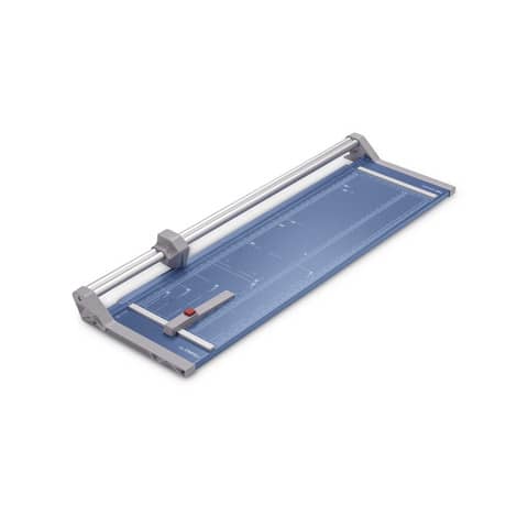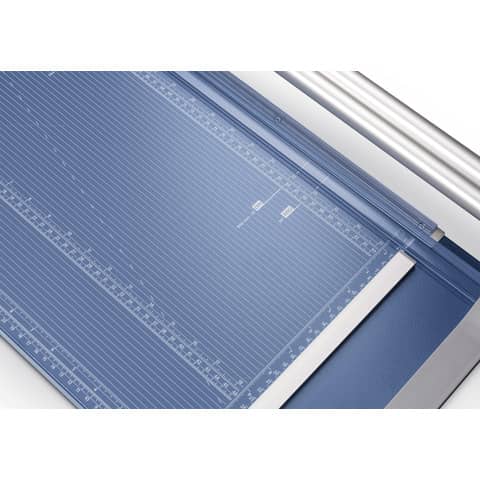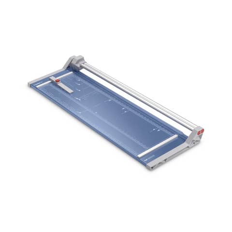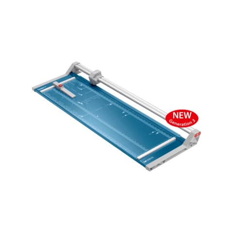 Rollenschneider Dahle 556. Stabiler Metalltisch mit rutschfesten Gummifüssen. Formatlinien mit cm/inch-Einteilung, Foto-und DIN-Formate. Beidseitige Winkelanlagen und Linealorientierung. Exakt positionierbarer Rückanschlag und doppelte Führungsstange. Rückseitige Standfüsse. Automatische Pressung. Max. Papierformat: DIN A1. Geschliffenes Rund- und Untermesser aus gehärtetem Stahl, Sicherheit durch Rundmesser im geschlossenen Kunststoffkopf, Gewicht: 6,4 kg. Farbe: blau. Tischgröße (B x T): 395 x 1180 mm. Länge des Schnittes: 960 mm. Max. Stärke des Stapels je Schnittarbeitsgang: 1.0 mm. Max. Anzahl der Blätter (80g/qm) je Schneidearbeitsgang: 20 Blatt. 3. Generation mit doppelter Führungsstange.