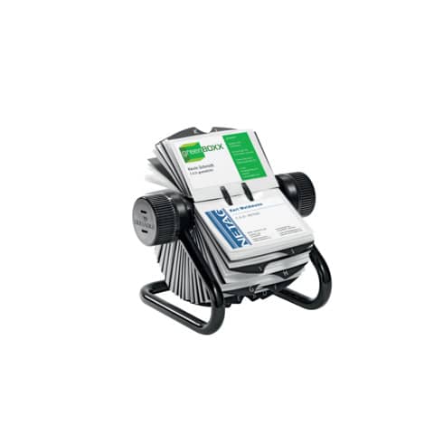 Rotationskartei mit Rohrgestell aus Metall. Pulverbeschichtet, mit Gummipads für sicheren Stand. Kartei für die Archivierung von Visitenkarten. Mit 200 Visitenkartenhüllen 104 x 72 mm (B x H) für 400 Karten. Inkl. 25-teiligem Register A-Z. Gezielter Zugriff durch speziellen Rollmechanismus möglich. Leichtes Entnehmen und Einstecken der Hüllen. Größe (B x H x T): 195 x 135 x 165 mm