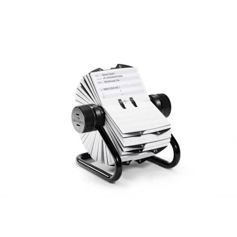 Rotationskartei mit Rohrgestell aus Metall. Pulverbeschichtet, mit Gummipads für sicheren Stand. Kartei für Telefon- und Adresseinträge mit 500 beidseitig bedruckten Karteikarten 72 x 104 mm (B x H) und 25-teiligem Register A–Z. Gezielter Zugriff durch speziellen Rollmechanismus. Leichtes Entnehmen und Einstecken der Karten. Größe (B x H x T): 195 x 135 x 165 mm.
