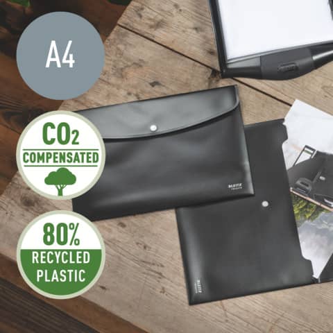 Leitz Sammelmappe Recycle. Hergestellt aus 80% recyceltem Material und zu 100% recycelbar. Klappe mit recycelbarem Druckknopfverschluss. Für die tägliche Aufbewahrung von Unterlagen und losen Blättern. Leicht, langlebig und wiederverwendbar. Blickdicht. Verpackungs-Banderole aus 100% recyceltem Karton. Fassungsvermögen: bis 150 Blatt DIN A4 (80 g/qm). Material: 80% recyceltes Polypropylen (PP) 0,5 mm. Format: für DIN A4, 235 x 320 mm. Farbe: schwarz.