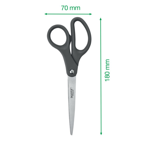 Leitz Titan Schere. Mit komfortablen, ergonomischen Griffen für bequeme, sichere und rutschfeste Handhabung. Mit verstellbarer Schraube Nachjustieren. Ultra-scharfe, titanbeschichtete Klingen liefern jahrelang hervorragende Leistung. Rostfreier Stahl für lange Haltbarkeit. Geeignet für Rechts- und Linkshänder. Plastikfreie Verpackung, Hängekarte aus Karton. Material: Titanbeschichtetes Edelstahl, rostfrei. Klingenlänge: 98 mm. Gesamtlänge: 180 mm. 5 Jahre Garantie. Farbe: dunkelgrau.