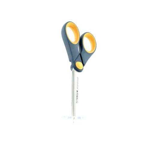 Schere Titanium Non Stick. Ausstattung: Schneidflächen mit Präzisionsschliff (Hohlschliff), haftabweisende Titannitrid beschichtete Klingen mit Non-Stick Formel. Durch die Non-Stick Formel sind die Klingen unempfindlich gegen jegliche Klebstoffe. Material: titanbeschichteter Edelstahl, grauer Kunststoffgriff mit gelbem Softgrip. Form: abgerundet, gerade, symmetrisch. Länge: 18 cm/7".