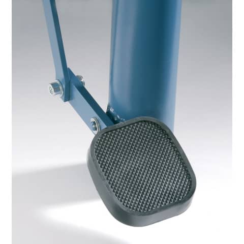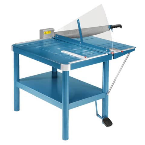 Atelier-Schneidemaschine Dahle 580. Ausführung der Sicherheitsausstattung: transparenter Messerschutz. Art der Betätigung der Pressung: Fußpressung. Ausstattung: Rückanschlag verstellbar, Raster mit Formatgrößen vorhanden. Max. Papierformat: DIN A2 = 42,0 cm x 59,4 cm. Geschliffenes Ober- und Untermesser aus Solinger Messerstahl. Masse (Gewicht): 60 kg. Farbe: Blau. Material des Tisches: Metall. Tischgröße (B x T): 600 x 920 mm. Länge des Schnittes: 815 mm. Max. Stärke des Stapels je Schnittarbeitsgang: 4,0 mm. Max. Anzahl der Blätter (70g/qm) je Schneidearbeitsgang: 40 Blatt. Max. Anzahl der Blätter (80g/qm) je Schneidearbeitsgang: 32 Blatt.