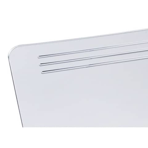 Transparente Schreibunterlage, unempfindlich und abwaschbar. Edle Schreibfläche mit hohem Schreibkomfort. Absolute Planlage auch bei großen Temperaturschwankungen. Die klassische 3-Linien-Prägung im oberen Bereich ist auch zur Stiftablage geeignet. Stärke: 1,1 mm.