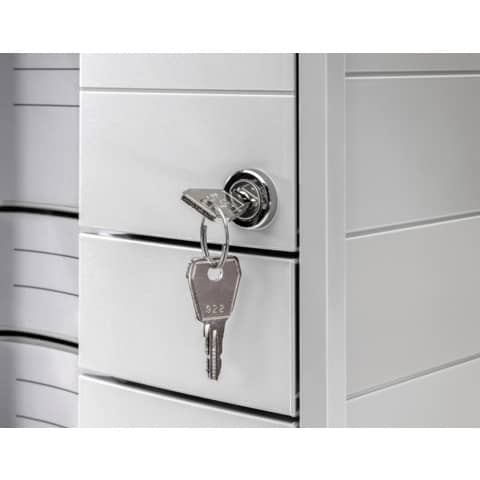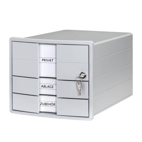 Schubladenbox IMPULS mit modernem Gehäusedesign. Mit 3 geschlossenen Schubladen (2 x Standard, 1 x extrahoch inkl. Schloss) für Papierformate DIN A4/C4. Innovatives, attraktives Design in höchster Qualität. Inkl. auswechselbarer Beschriftungsschilder mit hochwertiger Klarsichtabdeckung für ein einfaches Auffinden von Unterlagen. Leichtlaufende Schubladen mit Auszugssperre und durchgängig geschlossenem Boden. Extra stabile Gehäuseausführung mit optimierter Stapeltechnik. Rutschfeste, möbelschonende Gummifüße sorgen für einen sicheren Stand. Inkl. innovativem Schubladeneinsatz mit 6 unterschiedlich großen Fächern und Griff, der auch perfekt auf die Box mit der integrierten Stapelrippe gestellt werden kann. Die obere, extrahohe Schublade ist mit einem Zylinderschloss versehen und dadurch abschließbar. 2 Schlüssel sind im Lieferumfang enthalten. Ideal für die Aufbewahrung von vertraulichen Informationen und persönlichen Gegenständen. Made in Germany. Außenmaße (B x T x H): 280 x 367 x 235 mm. Innenmaße der Standard Schubladen (B x T x H): 240 x 325 x 37 mm, Innenmaß der extrahohen Schublade (B x T x H): 240 x 325 x 95 mm, daher ein hohes Fassungsvolumen. Material: hochwertiger Kunststoff, Polystyrol (PS). Farbe des Gehäuses: lichtgrau. Farbe der Schubladen: lichtgrau. Farbe des Schubladeneinsatzes: transparent-glasklar.