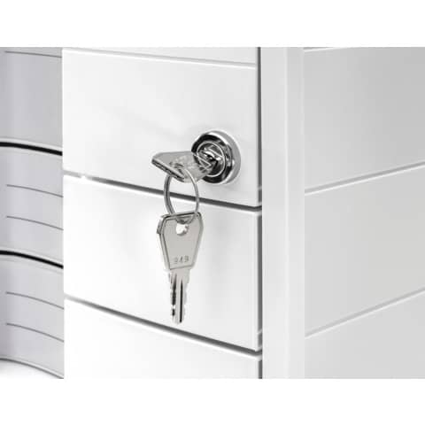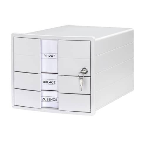 Schubladenbox IMPULS mit modernem Gehäusedesign. Mit 3 geschlossenen Schubladen (2 x Standard, 1 x extrahoch inkl. Schloss) für Papierformate DIN A4/C4. Innovatives, attraktives Design in höchster Qualität. Inkl. auswechselbarer Beschriftungsschilder mit hochwertiger Klarsichtabdeckung für ein einfaches Auffinden von Unterlagen. Leichtlaufende Schubladen mit Auszugssperre und durchgängig geschlossenem Boden. Extra stabile Gehäuseausführung mit optimierter Stapeltechnik. Rutschfeste, möbelschonende Gummifüße sorgen für einen sicheren Stand. Inkl. innovativem Schubladeneinsatz mit 6 unterschiedlich großen Fächern und Griff, der auch perfekt auf die Box mit der integrierten Stapelrippe gestellt werden kann. Die obere, extrahohe Schublade ist mit einem Zylinderschloss versehen und dadurch abschließbar. 2 Schlüssel sind im Lieferumfang enthalten. Ideal für die Aufbewahrung von vertraulichen Informationen und persönlichen Gegenständen. Made in Germany. Außenmaße (B x T x H): 280 x 367 x 235 mm. Innenmaße der Standard Schubladen (B x T x H): 240 x 325 x 37 mm, Innenmaß der extrahohen Schublade (B x T x H): 240 x 325 x 95 mm, daher ein hohes Fassungsvolumen. Material: hochwertiger Kunststoff, Polystyrol (PS). Farbe des Gehäuses: weiß. Farbe der Schubladen: weiß. Farbe des Schubladeneinsatzes: transparent-glasklar.