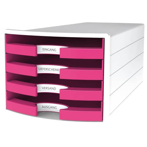 Schubladenbox IMPULS mit neuem, modernen Gehäusedesign mit 4 offenen, großzügigen Schubladen für Papierformate DIN A4/C4. Innovatives, attraktives Design in höchster Qualität. Inkl. großer auswechselbarer Beschriftungsschilder mit hochwertiger Klarsichtabdeckung für ein einfaches Auffinden von Unterlagen. Leichtlaufende Schubladen mit Auszugssperre und durchgängig geschlossenem Boden auch zur Kleinteile Organisation geeignet. Extra stabile Gehäuseausführung mit optimierter Stapeltechnik. Rutschfeste, möbelschonende Gummifüße sorgen für einen sicheren Stand. Made in Germany. Außenmaße (B x H x T): 280 x 235 x 367 mm. Innenmaße der Schubladen (B x H x T): 240 x 25 x 325 mm, daher ein hohes Fassungsvolumen. Material: hochwertiger Kunststoff, Polystyrol (PS). Farbe des Gehäuses: weiß. Farbe der Schubladen: pink.