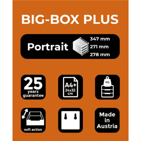 BIG-BOX PLUS mit 5 offenen Laden Ordnungs- und Ablagebox mit 5 offenen Laden für A4-Dokumente. Aus einem Guss gefertigtes Mono-Bloc Gehäuse, daher hoch belastbar. Die BIG BOX ist stapelbar dank der 4 Aussparungen. Offene Schubladen, mit denen die Dokumente direkt eingeschoben werden können. Federleichte Ladenführung mit einzigartigem Stopp-Mechanismus. Wird inklusive Etikettenhalter und Etikettenset Montag-Sonntag geliefert.