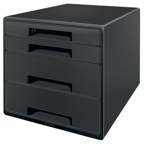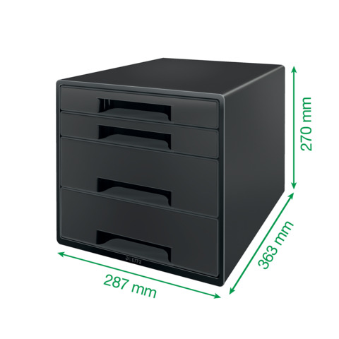 Leitz Schubladenbox Recycle CUBE. Hergestellt aus 90% recyceltem Kunststoff, 100% recycelbar. Mit 4 Schubladen: 2 hohe und 2 flach. Für Formate bis A4. Leicht laufende Schubladen mit Auszugsstopp. Einzigartiges Stay-Shut-Schubladensystem: ein Druck und die Schublade bleibt geschlossen. Mit ergonomischem Greifausschnitt für leichtes Öffnen. Schmale Schubladen mit ergonomischer Bodenaussparung für leichtes Entnehmen von Papieren. Mit rutschfesten Gummifüßen. Platzsparend bis zu 3 Boxen übereinander stapelbar. Mit seidenmatter, abwischbarer Oberfläche. Material: 90% recyceltes Polystyrol (PS). Format Außenmaß: 287 x 270 x 363 mm. Farbe: schwarz.
