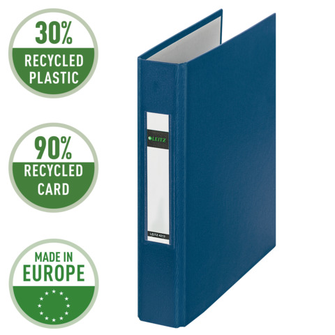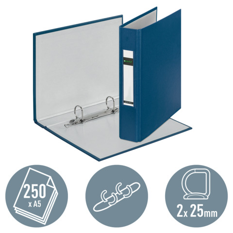 Ringbuch Standard. Mechanik: 2-Ring-Combi-D-Mechanik und Blattniederhalter. Ringdurchmesser: 25 mm, Füllhöhe: 20 mm, Rückenbreite: 41 mm. Material: Einband aus Pappe (RC), außen mit PP-beschichtetem Papier kaschiert. Format: 231 x 200 mm, für A5. Farbe: blau