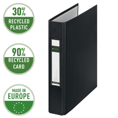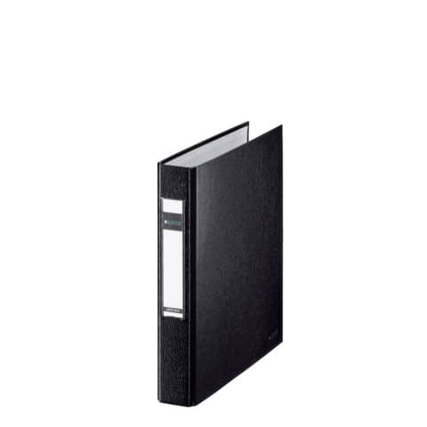 Ringbuch Standard. Mechanik: 2-Ring-Combi-D-Mechanik und Blattniederhalter. Ringdurchmesser: 25 mm, Füllhöhe: 20 mm, Rückenbreite: 41 mm. Material: Einband aus Pappe (RC), außen mit PP-beschichtetem Papier kaschiert. Format: 231 x 200 mm, für A5. Farbe: schwarz.