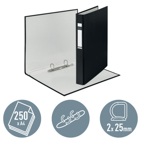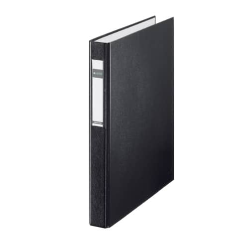 Ringbuch Standard. Mechanik: 2-Ring-Combi-D-Mechanik und Blattniederhalter. Ringdurchmesser: 25 mm, Füllhöhe: 20 mm, Rückenbreite: 41 mm. Material: Einband aus Pappe (RC), außen mit PP-beschichtetem Papier kaschiert. Format: 318 x 272 mm, für A4 Überbreite. Farbe: schwarz