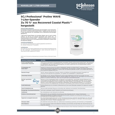 Der SCJ Professional® Proline WAVE 1-Liter-Spender kann mit dem gesamten Sortiment an SC Johnson Professional® Schaumseifen verwendet werden, die im Vergleich zu herkömmlichen Seifenlotionen ein effektiveres, angenehmeres Händewaschen bieten. Dabei werden bis zu 45 % weniger Wasser und 30 % weniger Produkt beim Waschen und Abspülen verbraucht. Das sind mehr Waschvorgänge mit derselben Produktgröße. Hergestellt mit 70% aus Recovered Coastal Plastic, das im Rahmen einer globalen Partnerschaft zwischen SC Johnson und der Umweltschutzorganisation Plastic Bank™ beschafft wird.