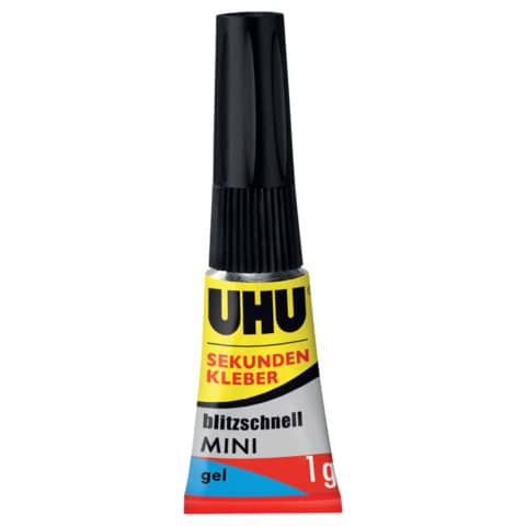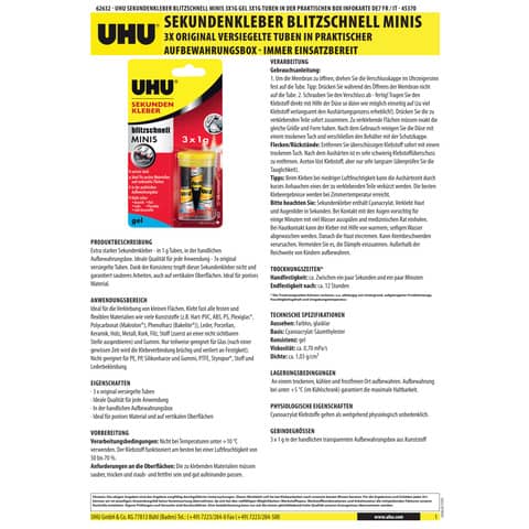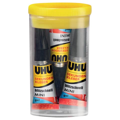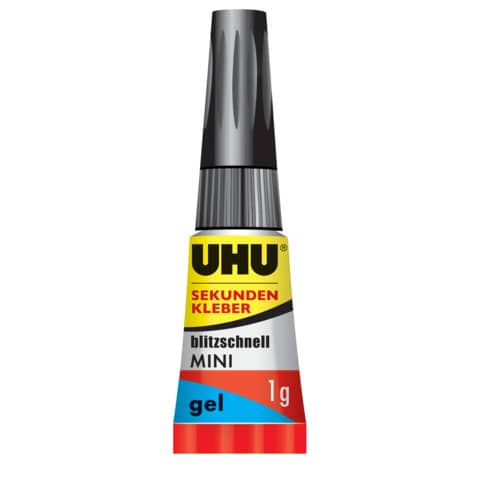 UHU® SEKUNDENKLEBER blitzschnell MINIS gel. Extrem starker Sekundenkleber- portioniert in 1 g Tuben, in der praktischen Aufbewahrungsbox. Optimale Qualität für jede Anwendung- 3x siegelfrisch. Aufgrund seiner gelartigen Konsistenz ermöglicht dieser Sekundenkleber ein tropffreies und sauberes Arbeiten, auch an senkrechten Flächen. Ideal für poröse Materialien. Spülmaschinenfest und wasserresistent (bei sachgemäßer Anwendung). Produktverwendung: klebt Porzellan, Keramik, viele Kunststoffe (z.B. PVC, ABS), Metall, Gummi, Holz, usw.. Nicht geeignet für Styropor®, Bekleidungstextilien/-leder, PE, PP. Aufbewahrungsbox mit 3 Tuben à 1g. Infokarte.