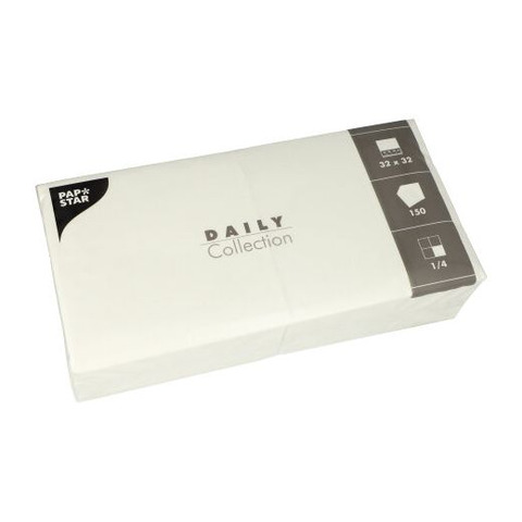 150 Servietten in der Packung aus der DAILY Collection 2-lagig. Offenes Format 32 x 32 cm, 1/4 Faltung auf gefaltetes Format 16 x 16 cm.