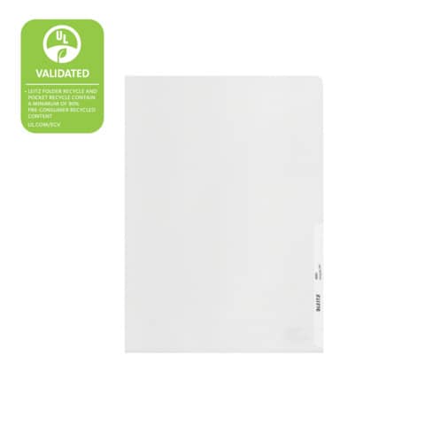 Leitz Sichthülle Recycle. Hergestellt aus 90% recyceltem und säurefreiem Material und zu 100% recycelbar (extern geprüft und von UL zertifiziert). Langlebig und wiederverwendbar. Säurefreies Material verhindert, dass das Papier mit der Zeit gelblich wird. Oben und rechte Seite offen. Mit Greifausschnitt. Genarbt. Dokumentenecht. Kunststofffreie Verpackung aus 100% recyceltem Karton, vollständig recycelbar. Material: 90% recyceltes Polypropylen (PP) 0,14 mm. Format: für DIN A4, 220 x 313 mm. Farbe: farblos.