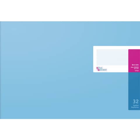 Mit 32 Querlinien und Textspalte, Schema über zwei Seiten gehend. Einband aus blau bedrucktem Karton. Papier 80 g/qm. Buch mit 40 Blatt. Blattgröße zzgl. 40 mm Kopfleiste.