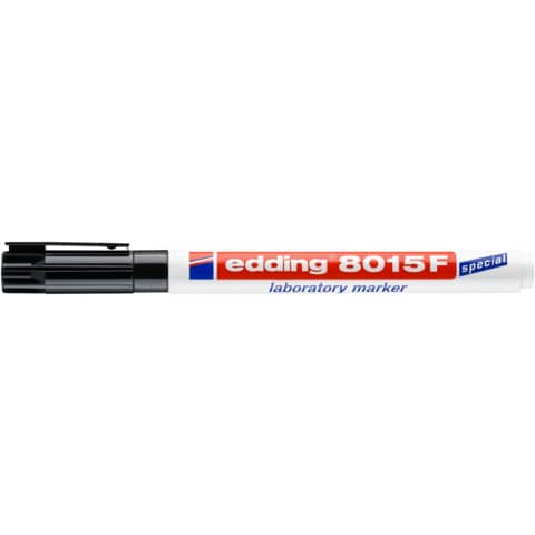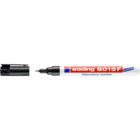 edding 8015F laboratory marker. Spezialmarker für den professionellen Einsatz im Labor entwickelt. Besonders geeignet für das Beschriften und Markieren von glatten und transparenten Oberflächen wie z.B. Reaktionsgläser, Laborgeräte und Etiketten im Labor. Permanent auf Kunststoff. Beschriftung kann mit einem auf alkoholbasiertem Reinigungsmittel von Glas entfernt werden. Schnelltrocknend, wisch- und wasserfest, lichtbeständig, geruchsarm, extrem abriebfest. Extrem kältebeständig bis -183°C und sehr gute Hitzebeständigkeit bis 100°C - auf Aluminium sogar bis 500°C. Feine Rundspitze. Kunststoffschaft. Kappe mit Clip. Strichstärke: ca. 0,75 mm. Schreibfarbe: schwarz