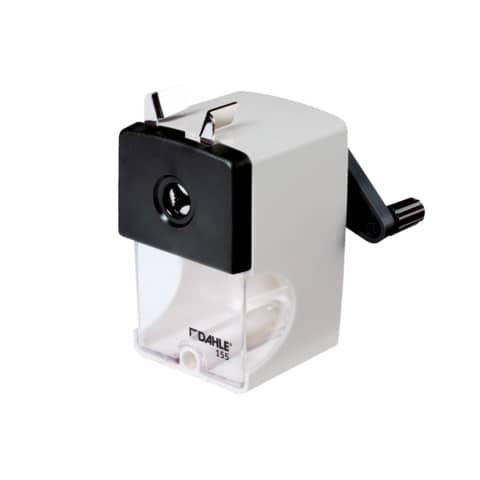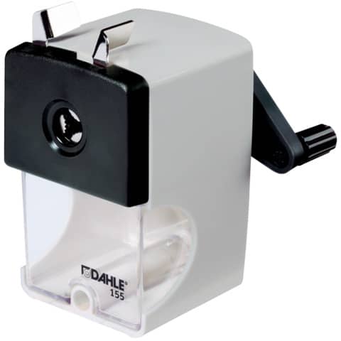 Bleistiftspitzmaschine Dahle 155. Für Stiftdurchmesser bis 12 mm, automatischer Spitzstopp. Spitzenform einstellbar. Stahlfräser. Kunststoffgehäuse mit transparentem Spänebehälter. Befestigung mit Zwinge. Größe (B x T x H): 108 x 64 x 159 mm. Farbe: Grau.