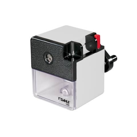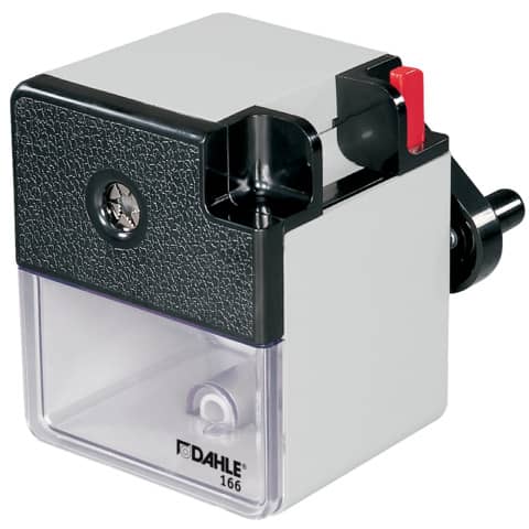 Bleistiftspitzmaschine Dahle 166. Für Stiftdurchmesser bis 12 mm, automatischer Spitzstopp. Spitzenform einstellbar. Stahlfräser, Gehäusematerial: Kunststoff mit transparentem Spänebehälter. Befestigung mit Zwinge. Größe (B x T x H): 129 x 99 x 131 mm. Farbe: Grau.
