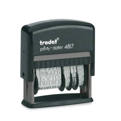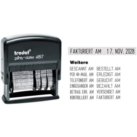 TRODAT 4817 Wortbandstempel mit Datum, selbstfärbend. Die Texte werden individuell mittels Einstellrad verstellt. Texte: GESCANNT AM, BESTELLT AM, BETRAG ERH. AM, PER @-MAIL AM, ERLEDIGT AM, KONTROLLIERT AM, TELEFONIERT AM, GEBUCHT AM, VERSENDET AM, EINGANG AM; BEZAHLT AM, FAKTURIERT AM. Das Datum (Monat in Buchstaben) lässt sich ebenfalls individuell einstellen. Ein schwarzes Stempelkissen gehört zum Lieferumfang. Abdruckgröße ca. 4,6 x 0,4 cm. Stempelgröße: 7 x 2,5 x 8 cm.