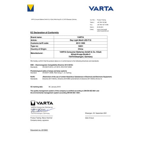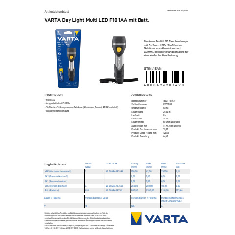 | Hersteller: | VARTA Consumer Batteries GmbH & Co. KGaA, Alfred-Krupp-Str. 9 73479 Ellwangen Deutschland, info@varta-household.com |