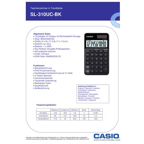 Weiterführende Links zu "Taschenrechner 10-stellig schwarz CASIO SL-310UC-BK"