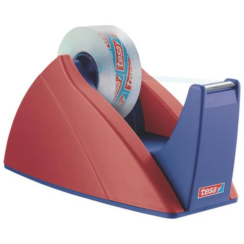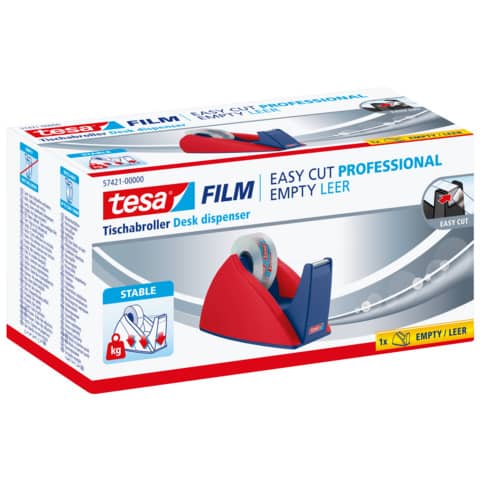 Tischabroller für Klebefilm tesa Easy Cut®. Messer auswechselbar. Standfest, sauberer Schnitt. Größe (B x H x T): 75 x 80 x 160 mm. Bandgröße max. (L x B): 33 m x 19 mm. Farbe: rot-blau.