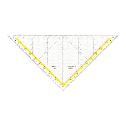 Zeichendreieck TZ-Dreieck®. Werkstoff: Plexiglas®. Ausführung der Tuschenoppen: unterseitig. Farbig hinterlegte Winkelgrade vorhanden. Erfüllt alle Anforderungen der ÖNORM A2134, geprägte Teilungsstriche. Länge der Hypotenuse: 225 mm. Farbe: glasklar.