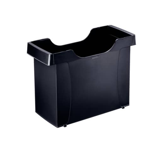 Hängemappenbox Uni-Box Plus Plus, Lieferung ohne Hängemappen. Besonders standfest, niedrige Vorderseite für bessere Lesbarkeit der Beschriftungsschilder, stapelbar, passend für all A4 Hängemappen, mit komfortablen Tragegriffen. Material: Polystyrol (PS). Format: 400 x 275 x 170 mm. Farbe: schwarz.