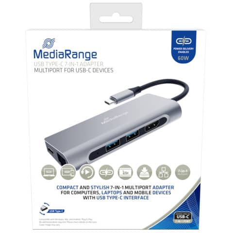 Der MediaRange USB Type-C all in one Verteiler mit integriertem USB TypeC Anschlusskabel und 6 Ausgängen eignet sich ideal zum Anschluss von nahezu allen Endgeräten (z.B. Maus, Tastatur, Drucker, externe Festplatte, Monitoren, Fernsehern, Netzwerkkabeln SD-/MicroSD Karten, Smartphones, Tablet PC, Computer oder Laptops!).