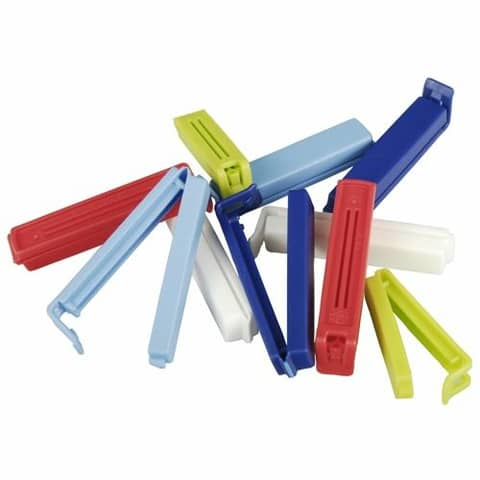 10 Verschluss-Clipse, PP farbig sortiert (2 x 11 cm rot, 2 x 6 cm gelb, 2 x 6 cm grün, 2 x 4 cm weiß, 2 x 4 cm blau). Mikrowellen- und Spülmaschinengeeignet. Nutzbar als Gefrierbeutelverschluss oder Tütenverschluß.
