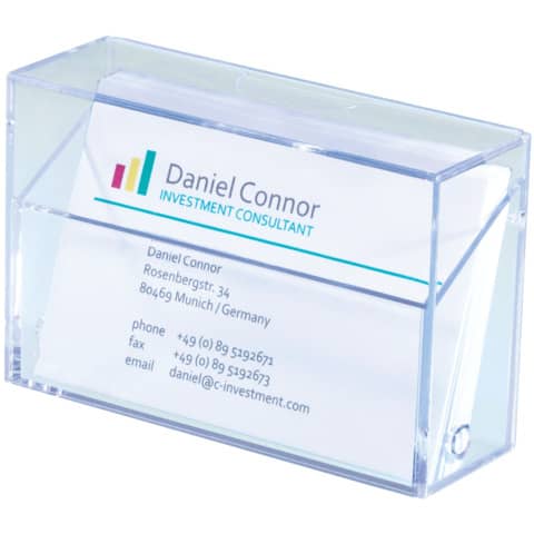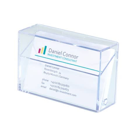 Handliche Visitenkarten-Box aus glasklarem Hartplastik für die praktische Aufbewahrung von Visitenkarten. Im Handumdrehen auch als offener Aufsteller für die Präsentation nutzbar. Für ca. 100 Karten bis max. 86 x 56 mm.