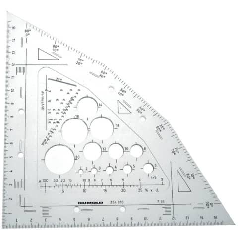 Techno-Combi-Winkel aus unzerbrechlichem Makralon. Universelles Zeichendreieck mit festen Winkeln von 15, 30, 45, 60 und 90 Grat. Zusätzlicher Winkelmesser, Parallellinien, Lotlinen, Kreise von 2-20 mm, Hilfslinien für Normschrift IS =/DIN 2,5, 3,5, 5 und 7mm. Abgreifteilung zum Zeichnen von Vielecken und zum prozentualen Aufteilen des Kreises.