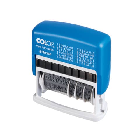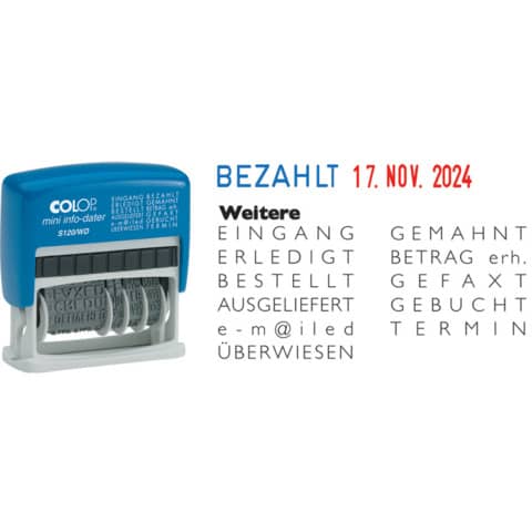 Colop Mini-Dater bieten viele Möglichkeiten des Abdrucks für den täglichen Bürobedarf! Schriftgröße 4 mm. Mit blau/rotem Stempelkissen ausgestattet. Text: EINGANG, BESTELLT, AUSGELIEFERT, E-Mail, ÜBERWIESEN, BEZAHLT, GEMAHNT, BETRAG erh., GEFAXT, GEBUCHT, TERMIN.